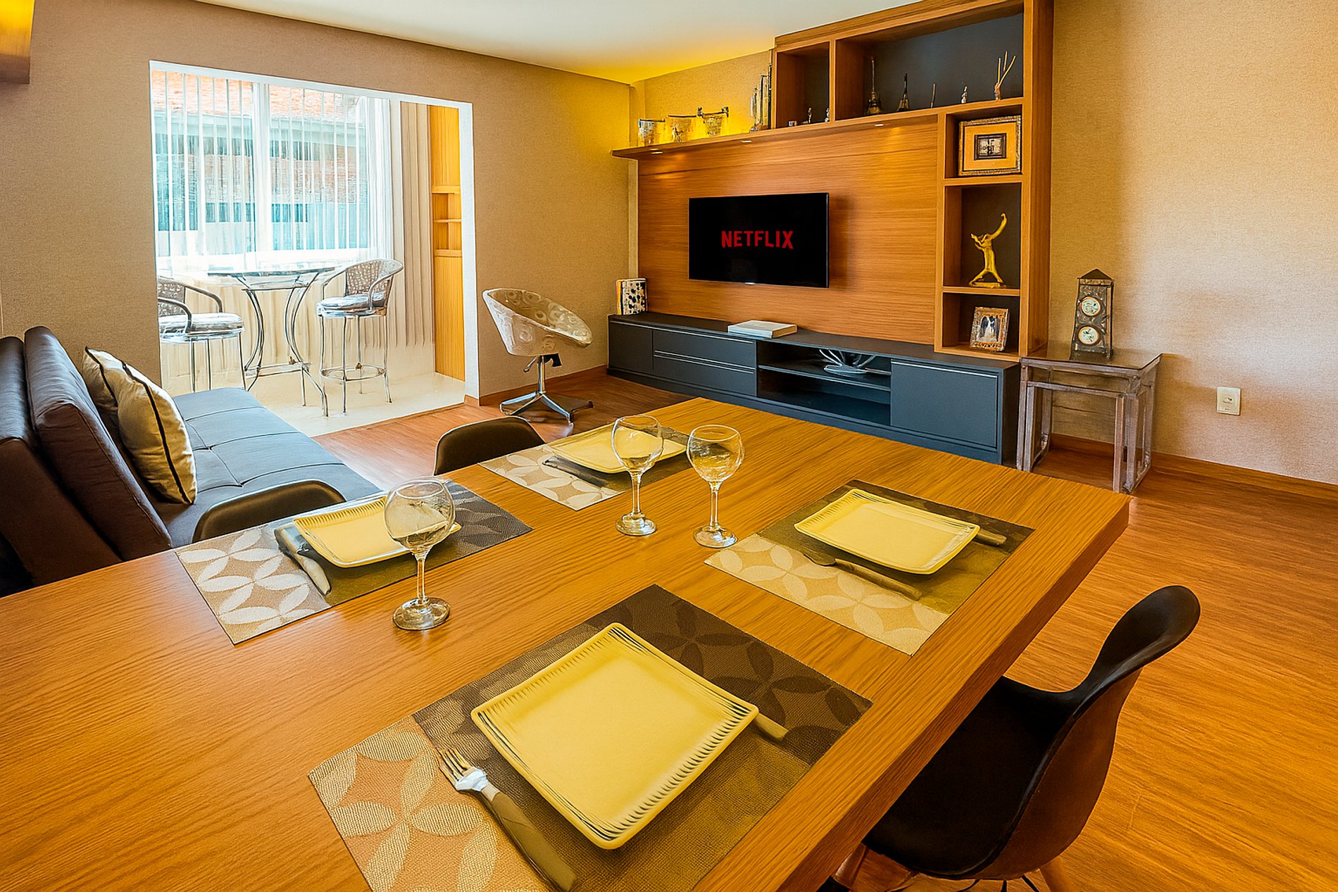 - Mesa para refeições , com taças de vinho, espumante e jogo de mesa posta.