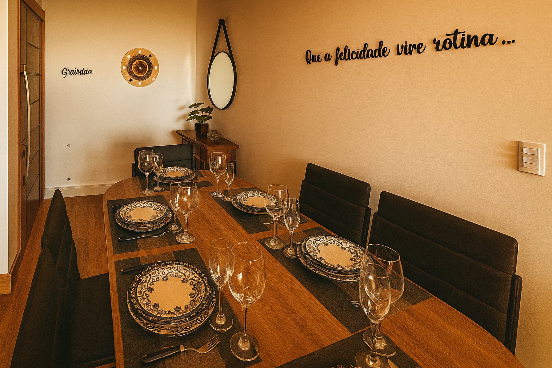 - Mesa para refeições , com taças de vinho, espumante e jogo de mesa posta.