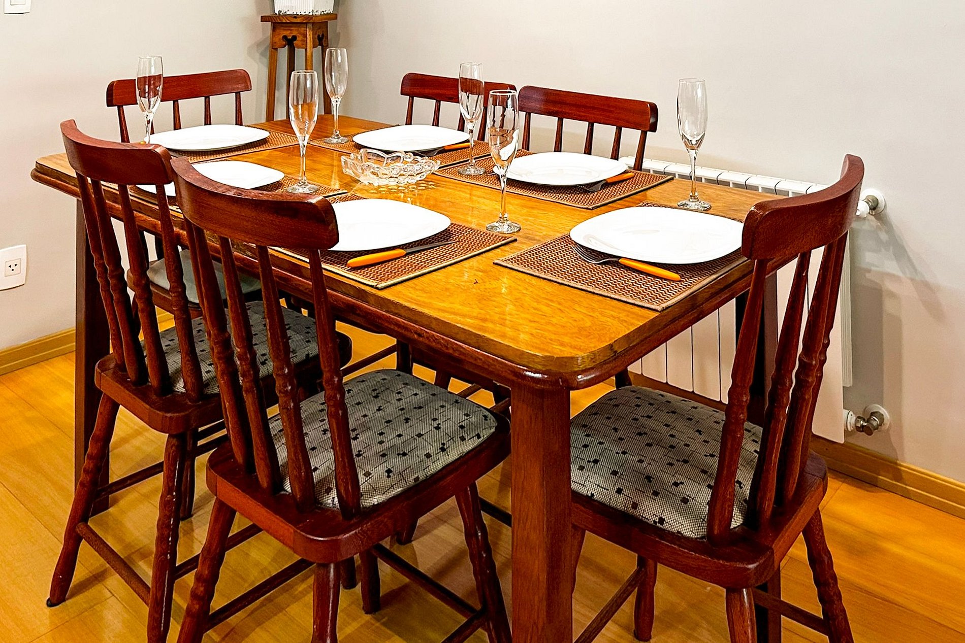 - Mesa para refeições , com taças de vinho, espumante e jogo de mesa posta.