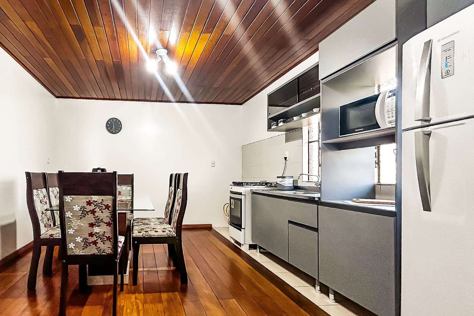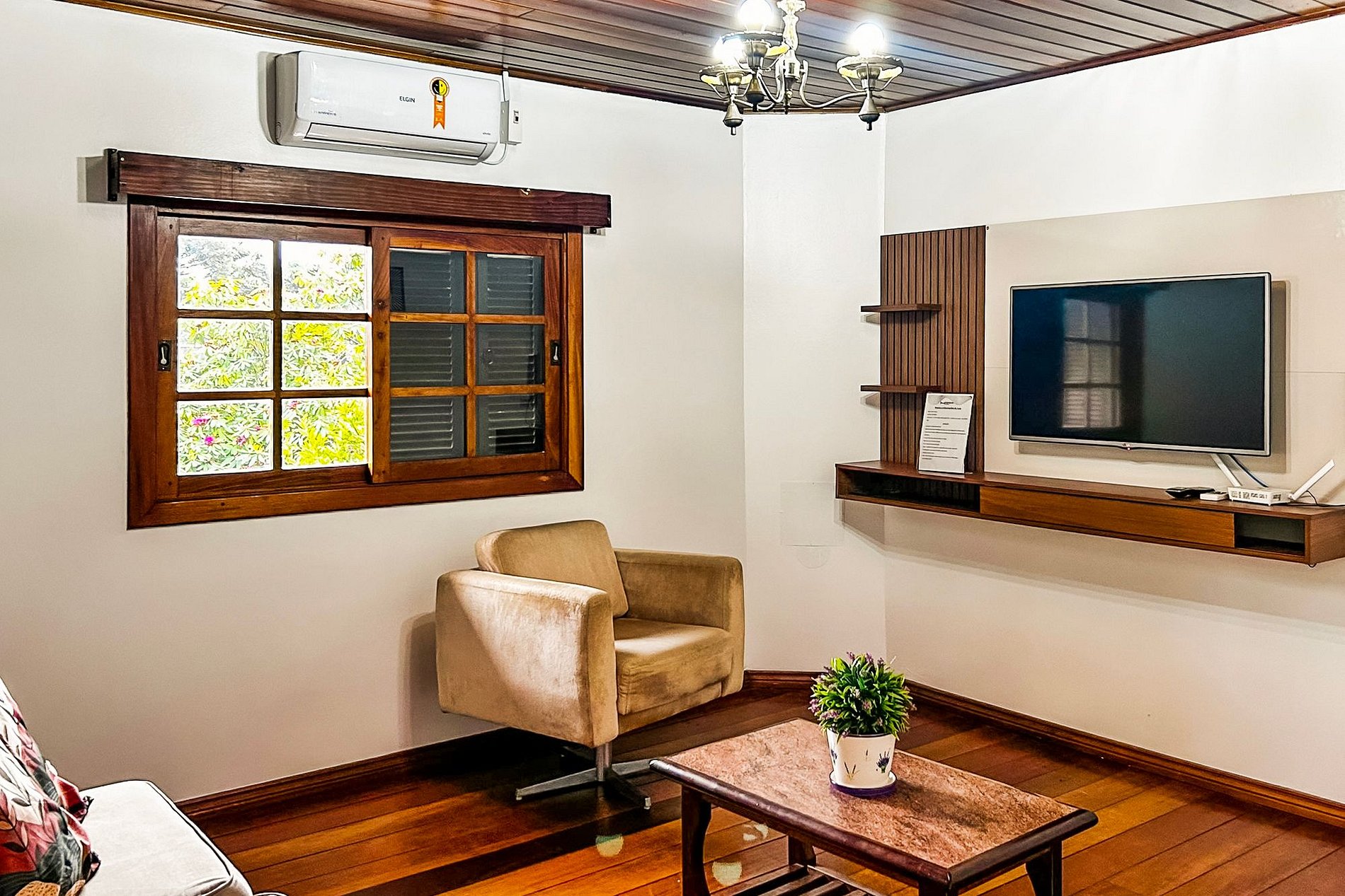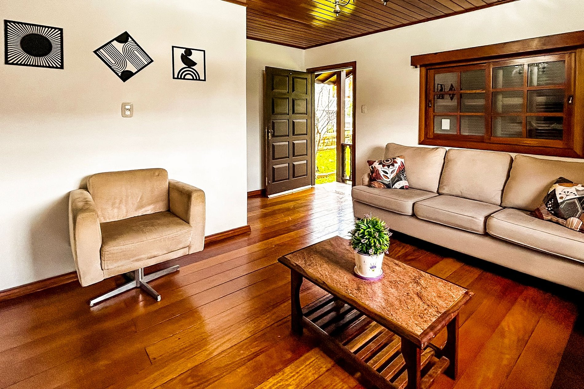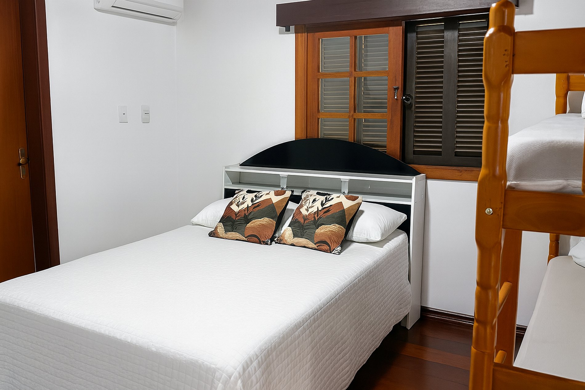 Casa completa no Centro de Gramado. A Casa conta com uma ampla área verde no Centro, com vaga de garagem, espaço para festas e muito mais. A casa possui 3 quartos com beliches e camas de casais, que ao todo comportam 10 hóspedes. Possui ar condicionado em todos os cômodos, que além de resfriarem o ambiente podem esquentá-los. A cozinha possui todos os utensílios e eletrodomésticos, necessários para que possam ter uma estadia completa. Por fim uma área de serviço com máquina de lavar roupa.