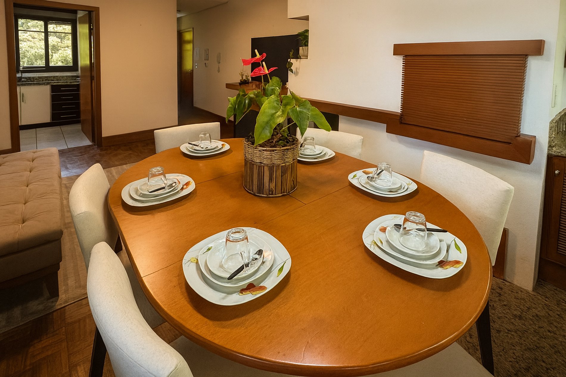 - Mesa para refeições , com taças de vinho, espumante e jogo de mesa posta.