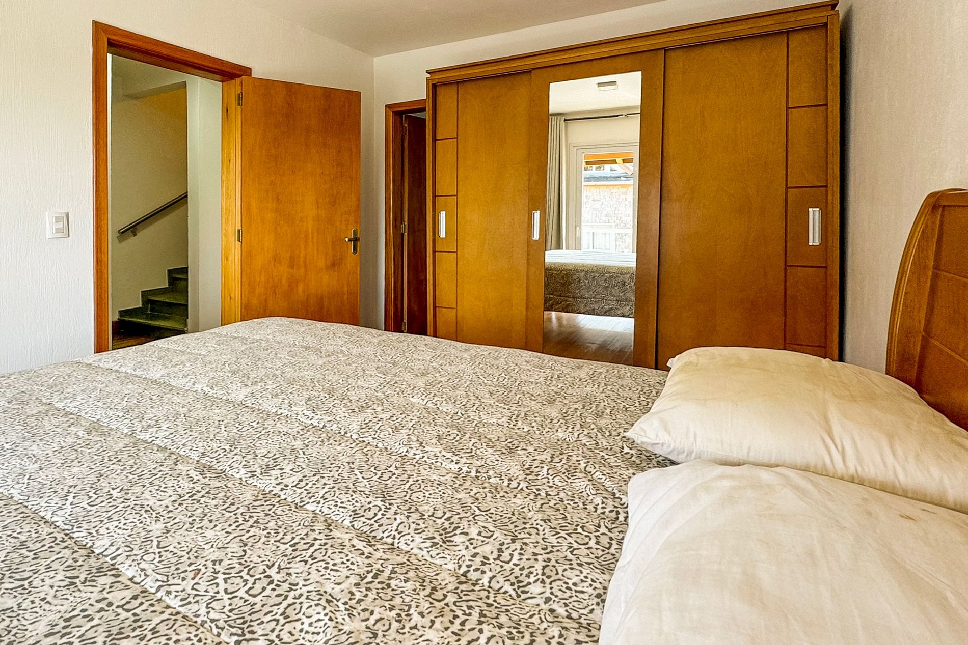 Casa charmosa no centro de Gramado, em condomínio fechado com garagem. São 3 andares amplos, com 2 suítes (camas de casal) e 1 quarto com cama de casal e sofá-cama, acomodando até 8 pessoas. Cozinha equipada com utensílios e eletros para uma estadia prática. Sala aconchegante com lareira, sofá e TV para momentos de descanso.