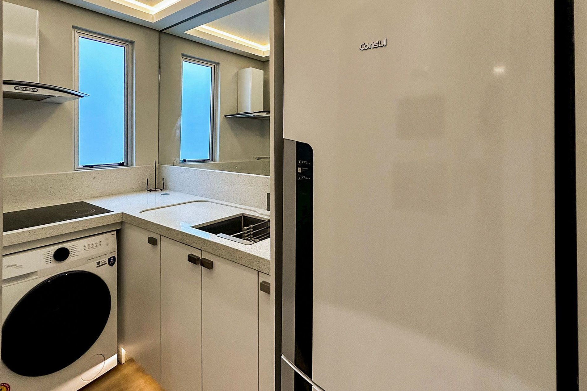 - Cozinha compacta equipada com geladeira e utensílios de cozinha.
