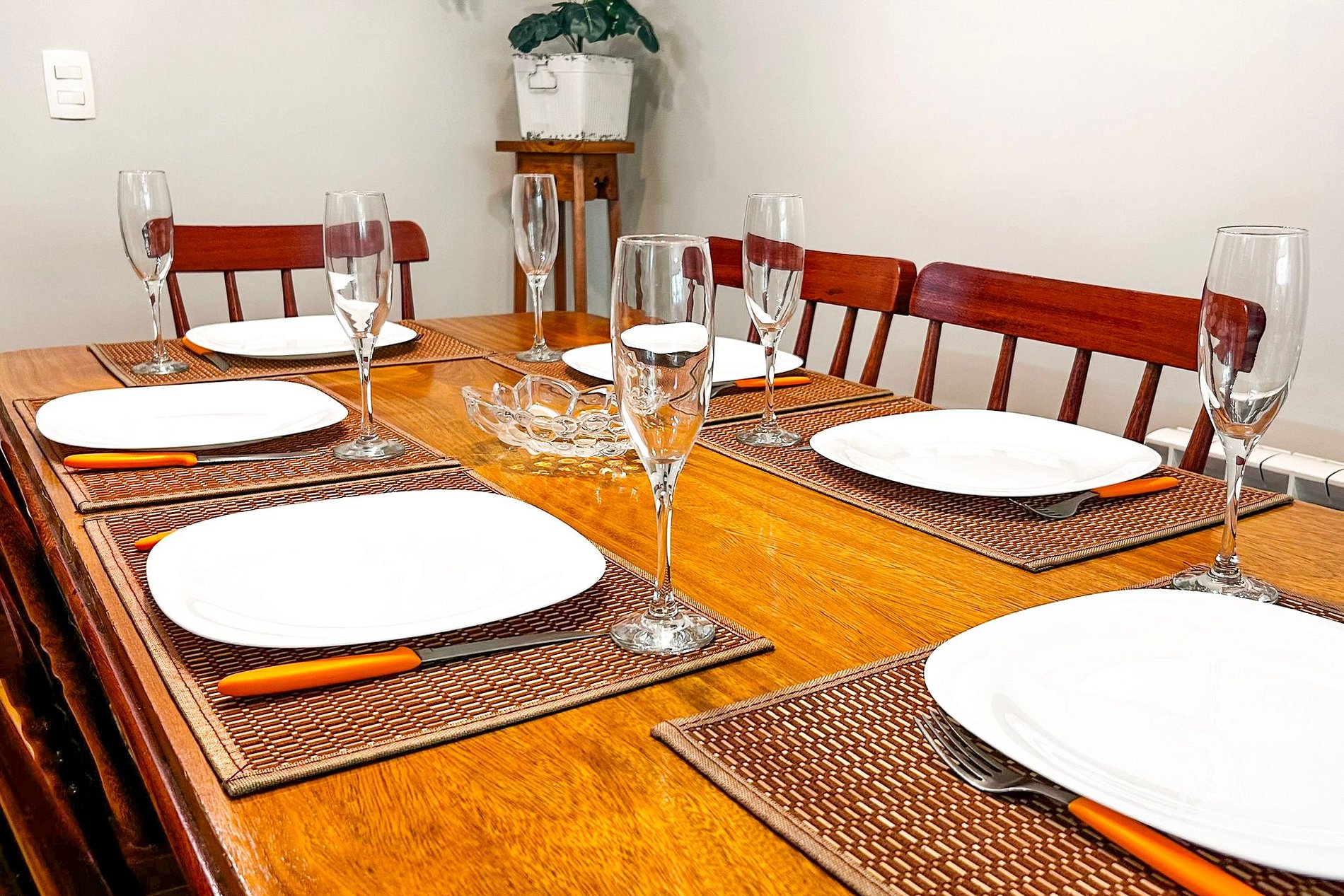 - Mesa para refeições , com taças de vinho, espumante e jogo de mesa posta.