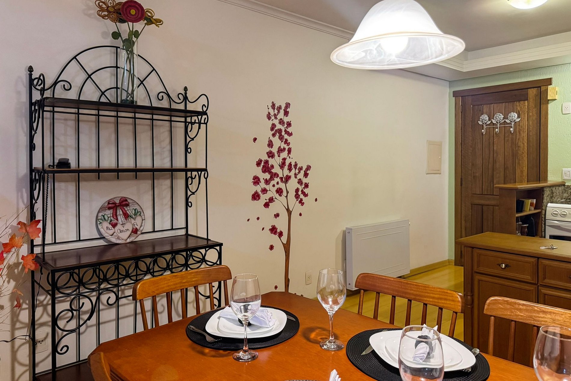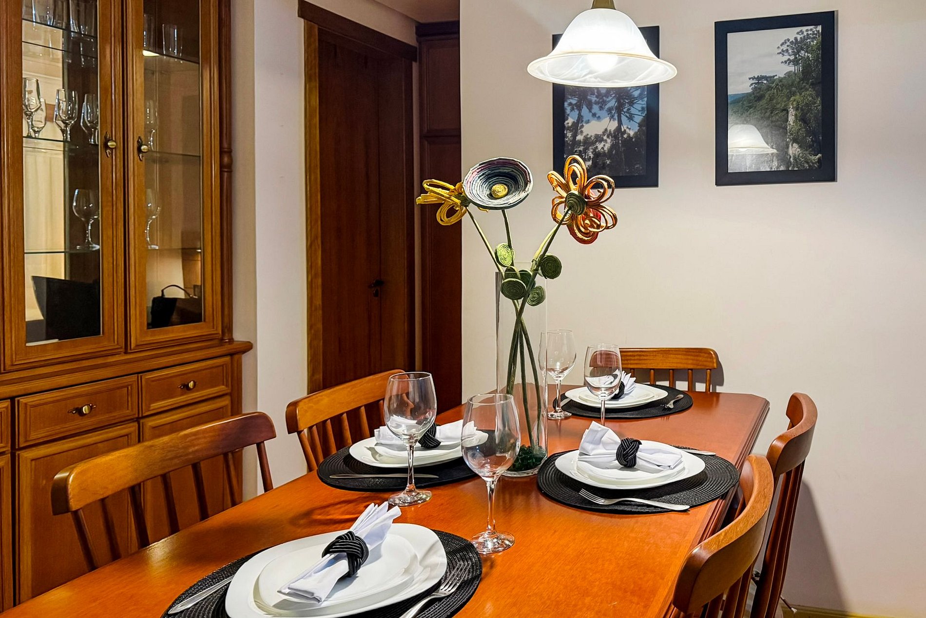 - Mesa para refeições , com taças de vinho, espumante e jogo de mesa posta.