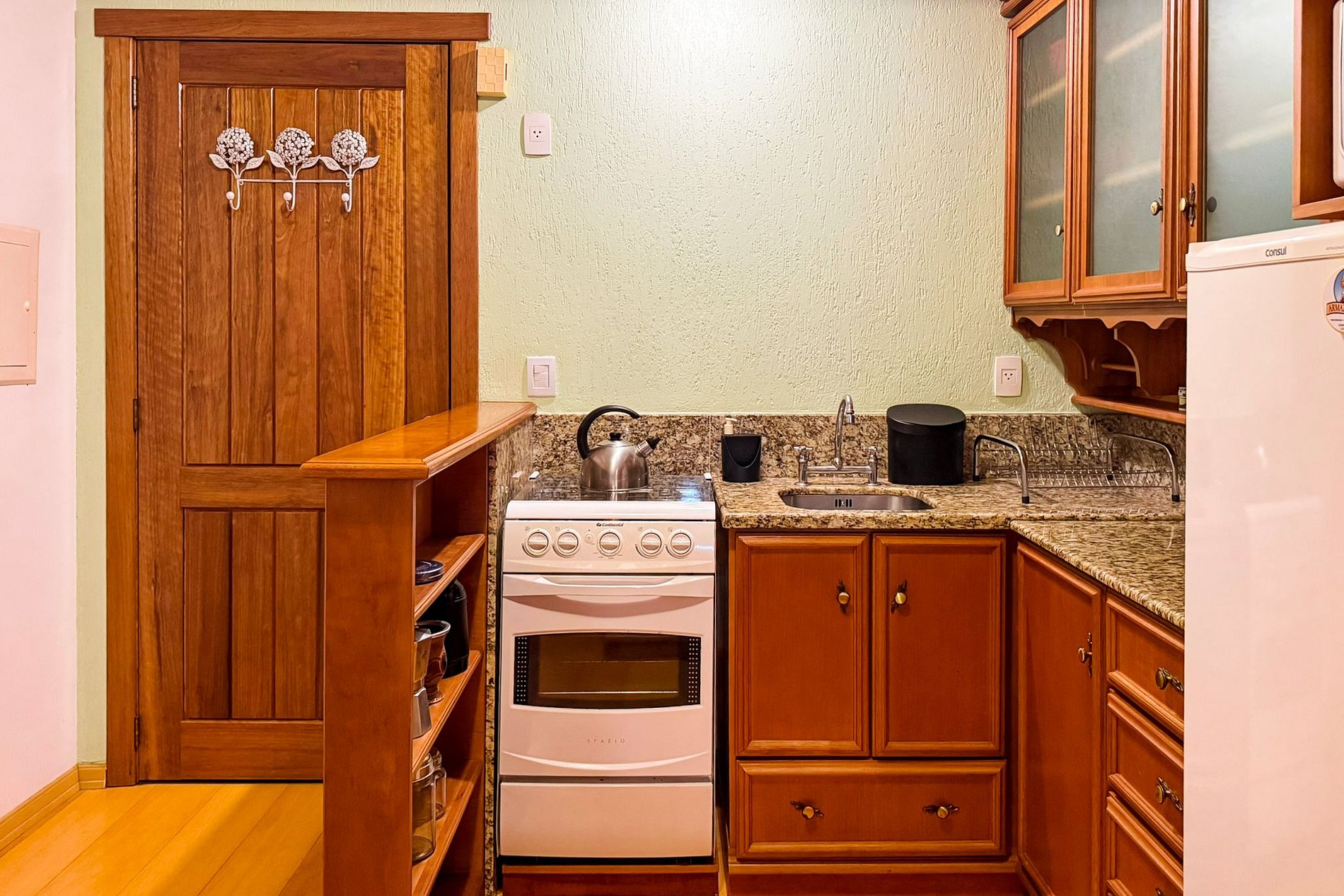 - Cozinha compacta equipada com geladeira e utensílios de cozinha.
