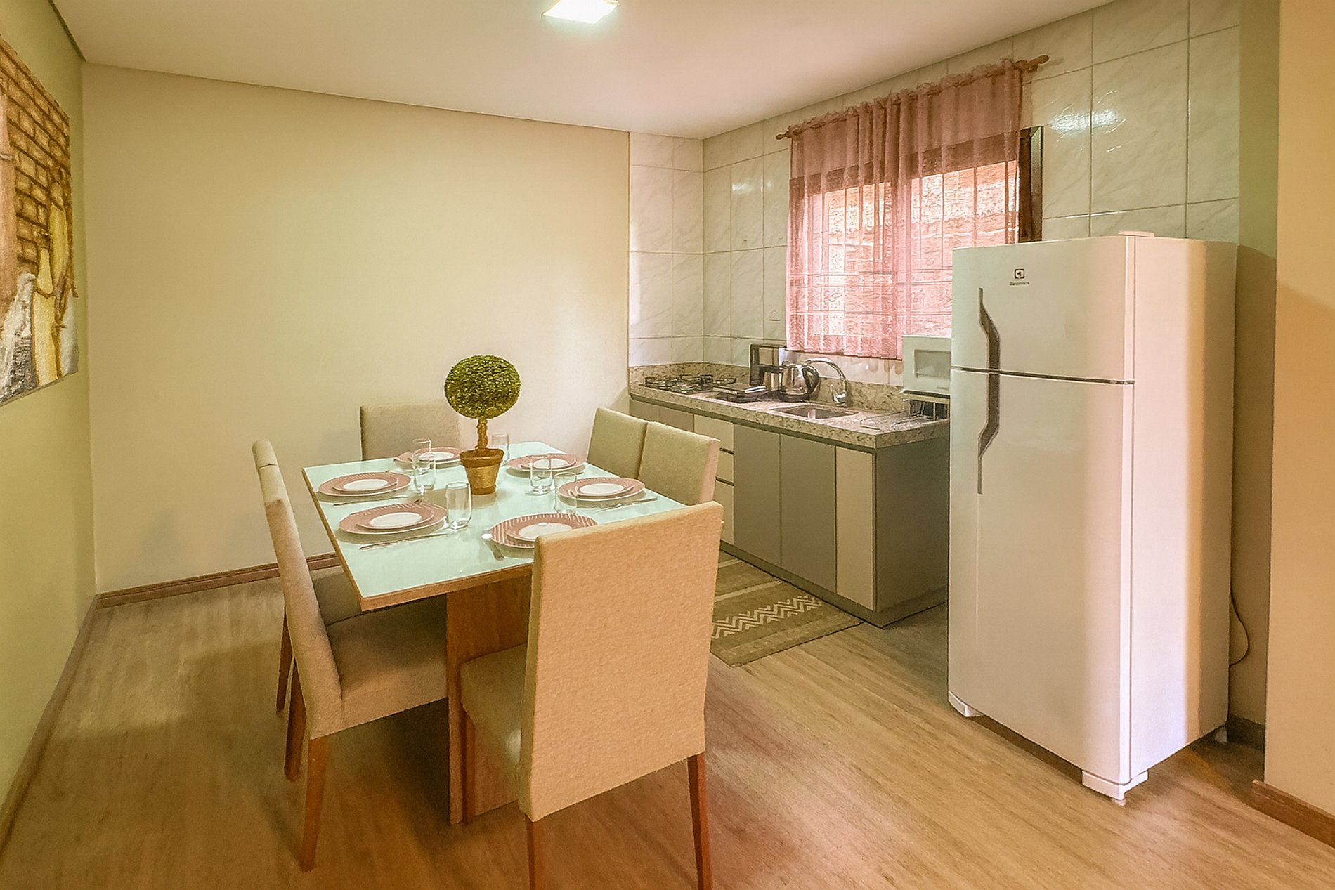 - Cozinha equipada com geladeira e utensílios de cozinha.