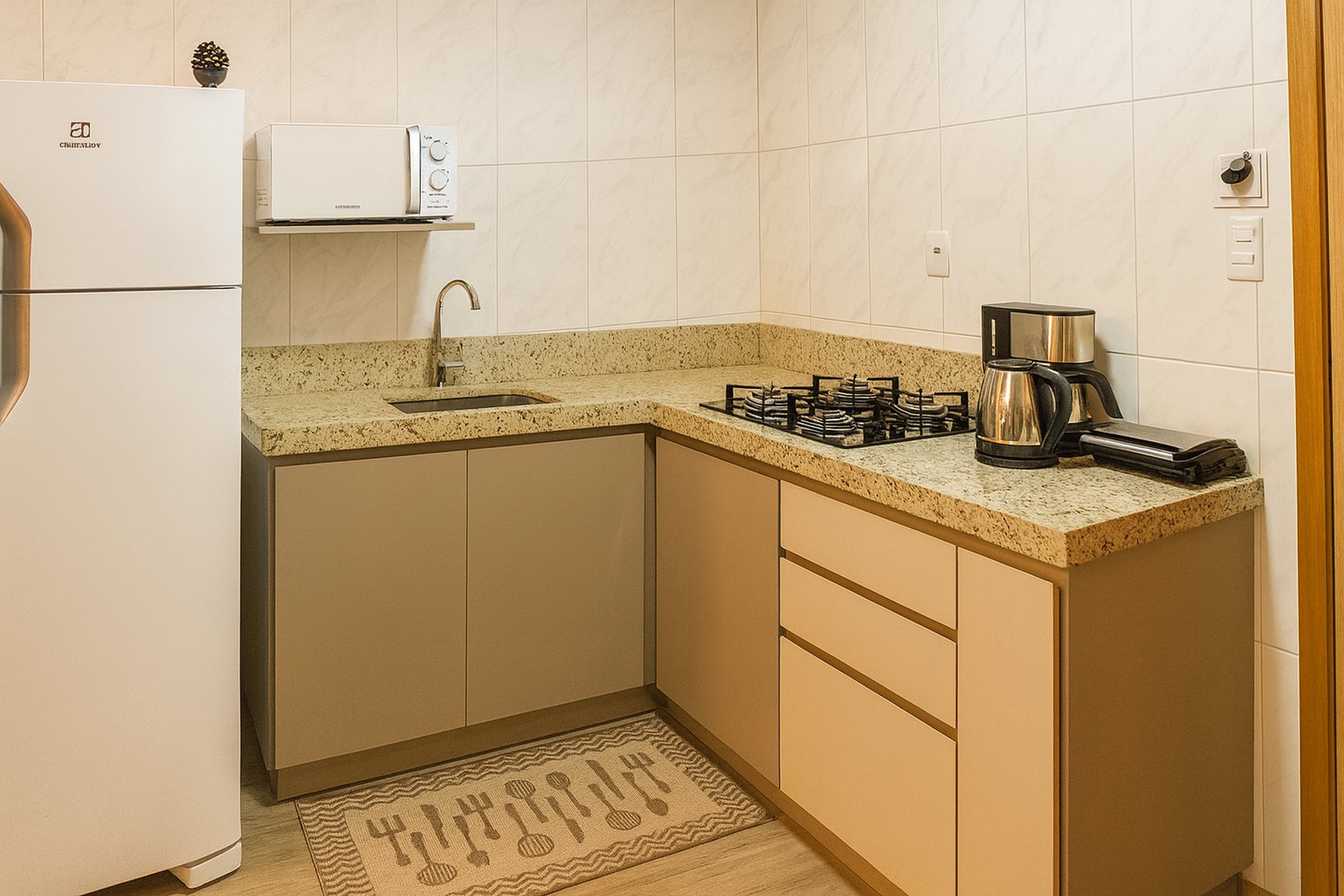 - Cozinha equipada com geladeira e utensílios de cozinha.