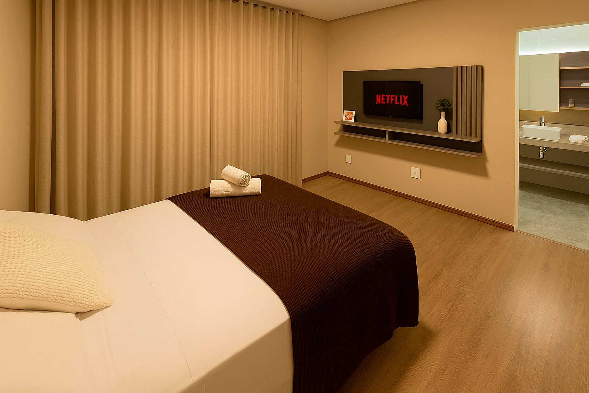 O hóspede realiza o check-in por conta própria, com total liberdade para chegar no horário que preferir — uma facilidade que torna a experiência ainda mais prática e confortável.