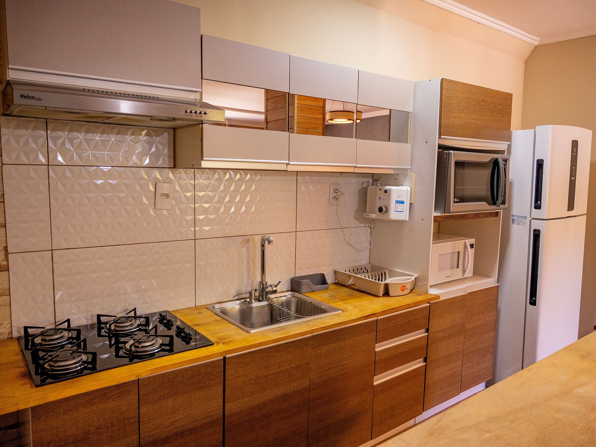 - Cozinha equipada com geladeira e utensílios de cozinha.