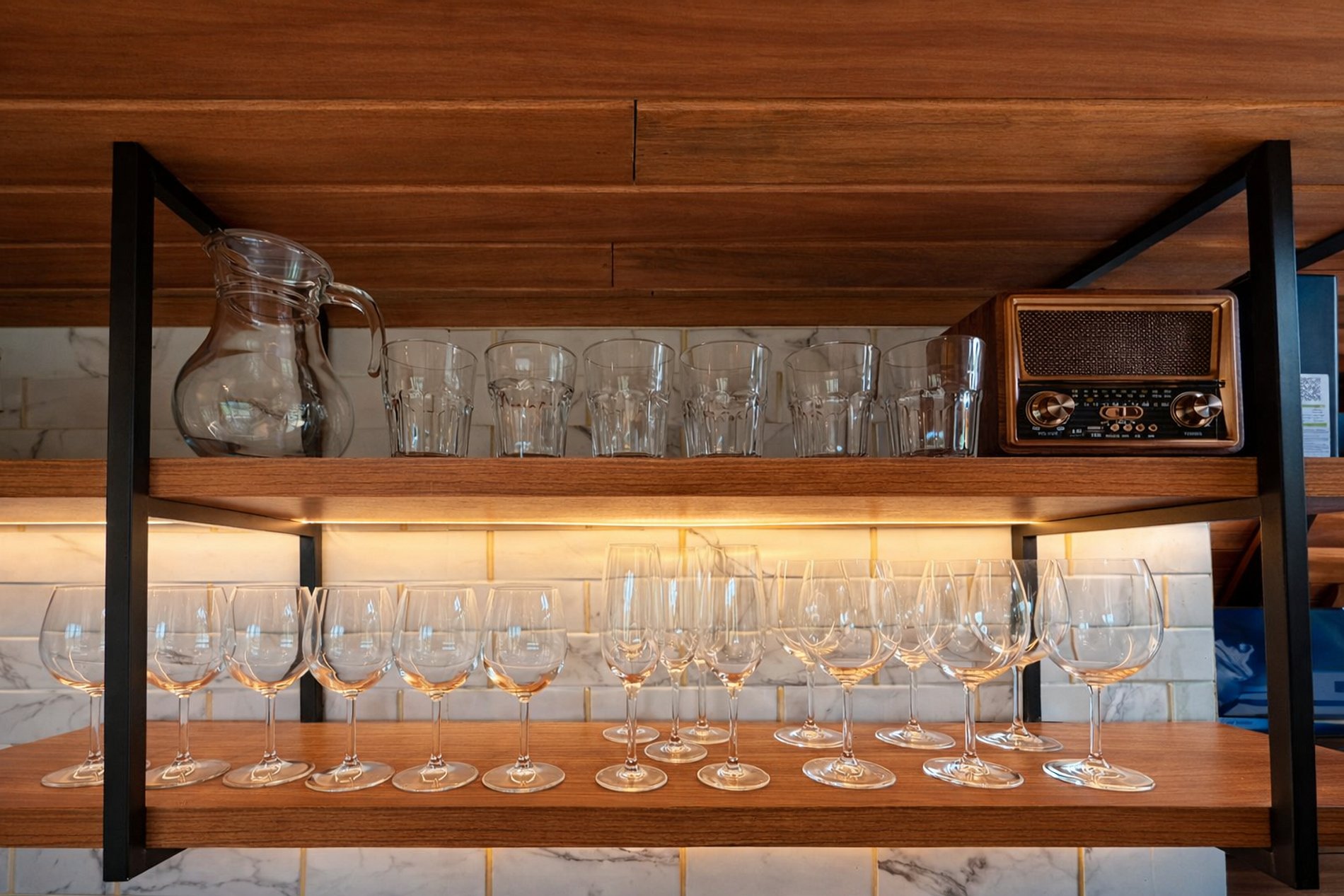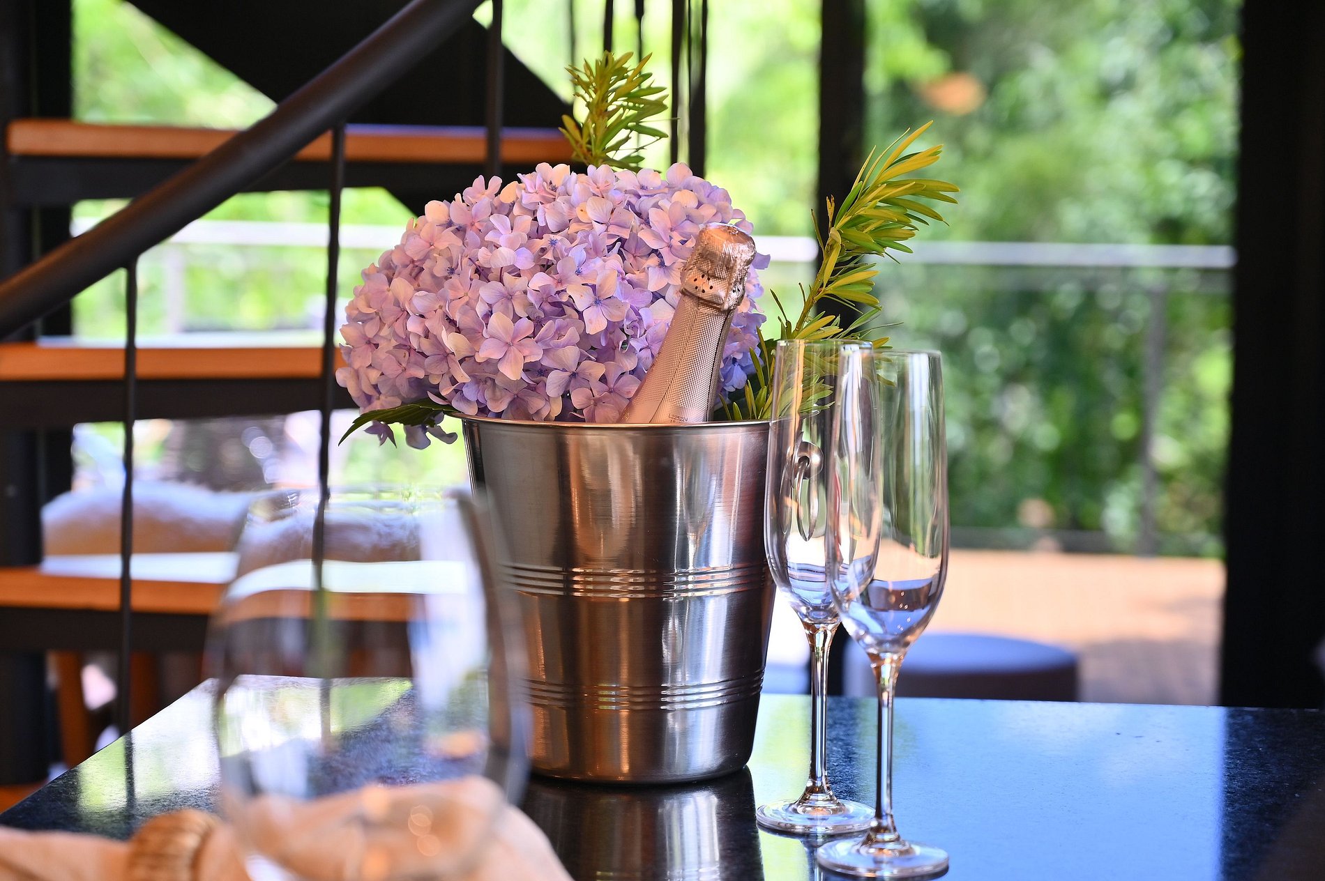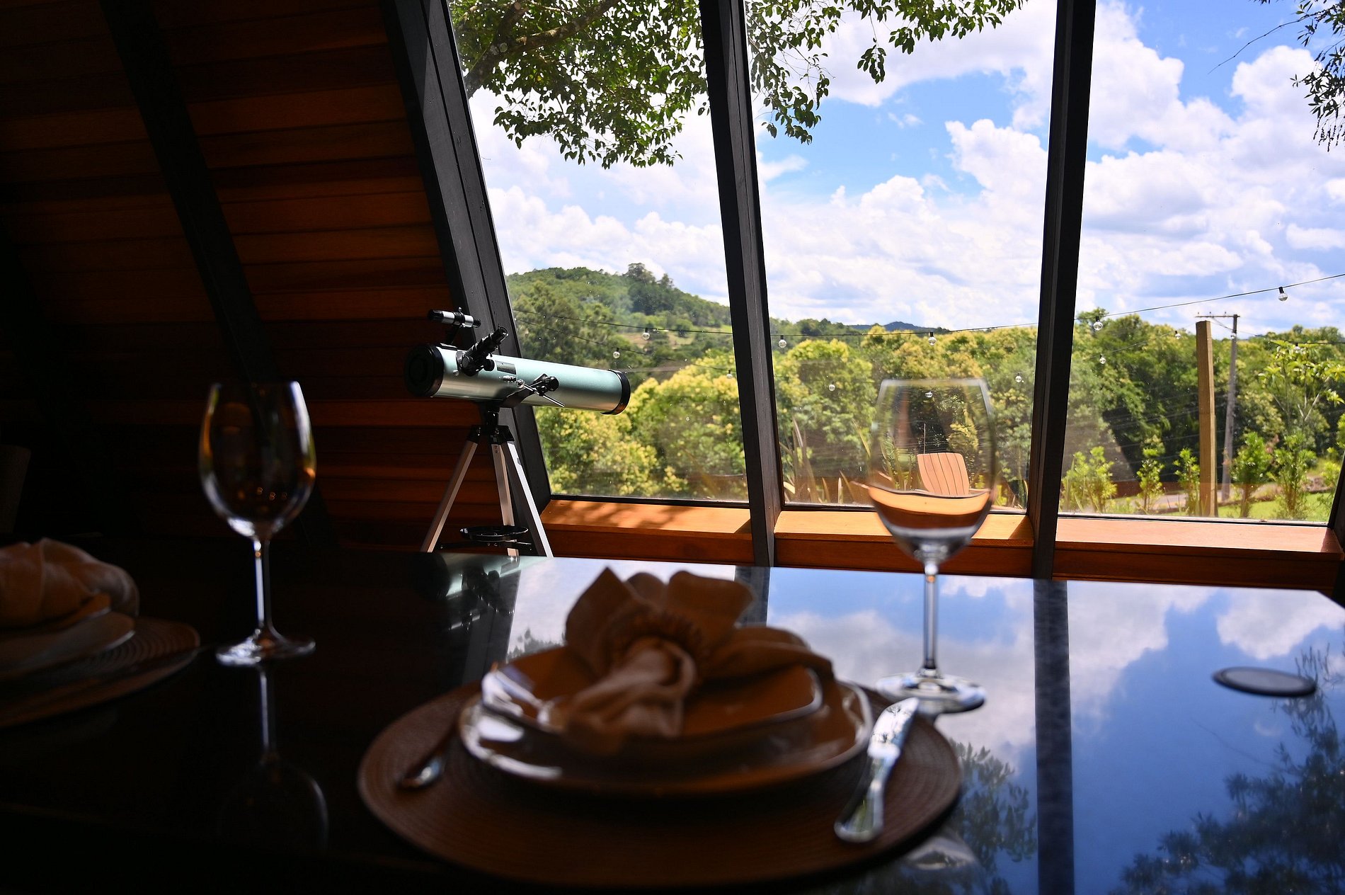- Mesa para refeições , com taças de vinho, espumante e jogo de mesa posta.