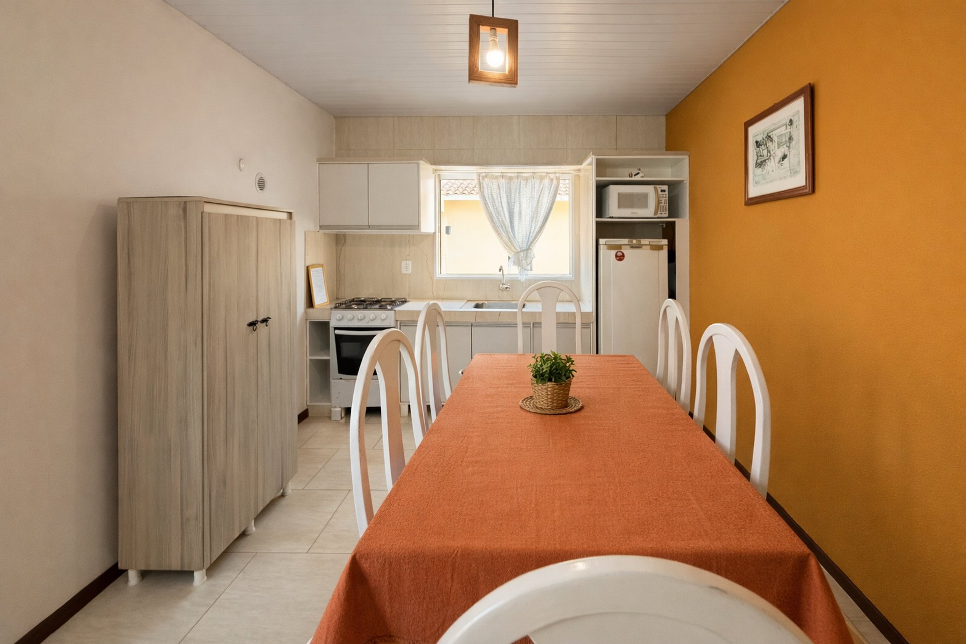 - Cozinha equipada com geladeira e utensílios de cozinha.