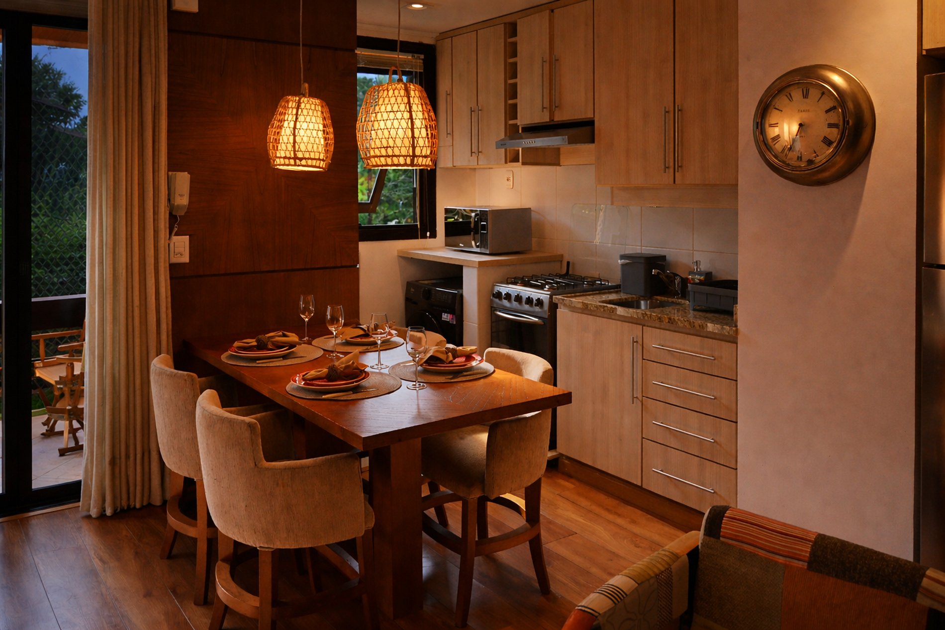- Mesa para refeições , com taças de vinho, espumante e jogo de mesa posta.