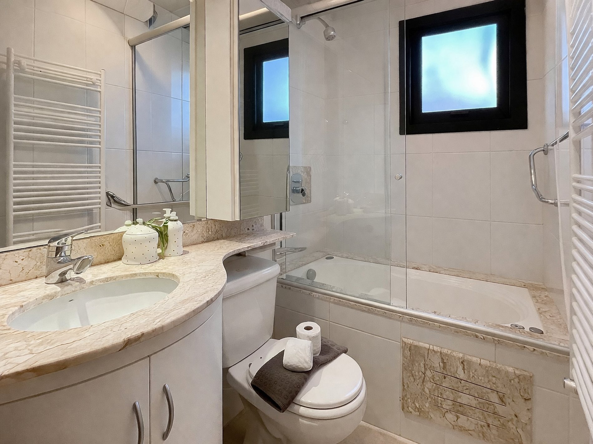 - 02 Rolos de papel higiênico por banheiro/lavabo (sem reposição durante a estadia).