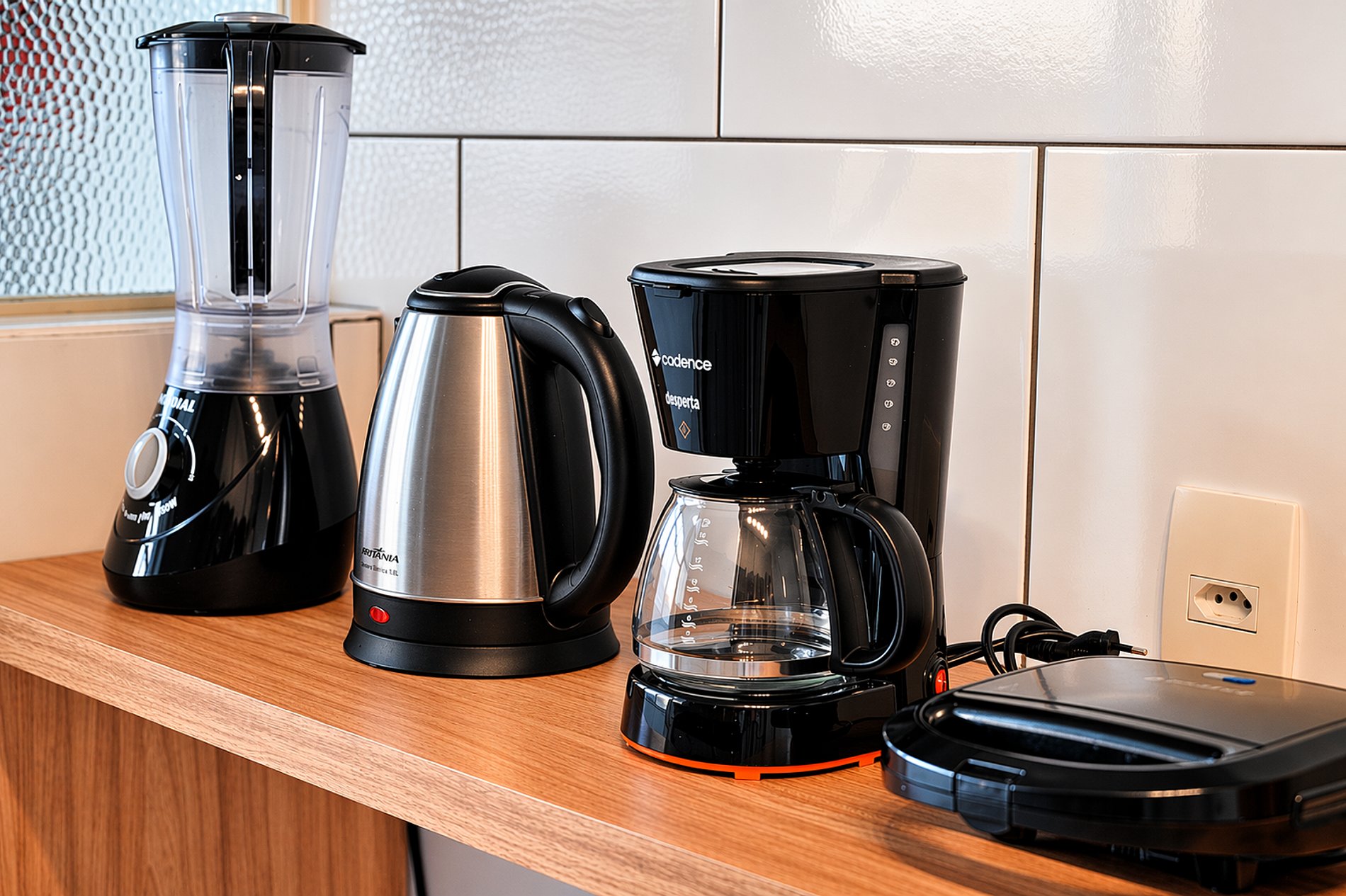 - Cozinha equipada com geladeira e utensílios de cozinha.