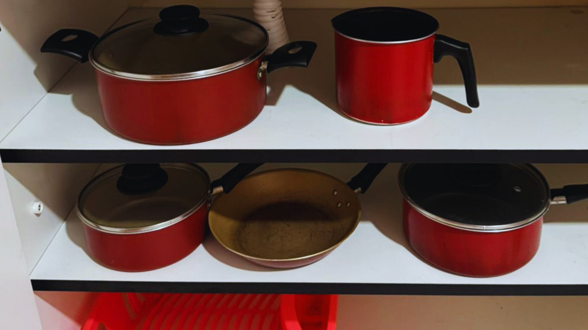 - Cozinha compacta equipada com geladeira e utensílios de cozinha.