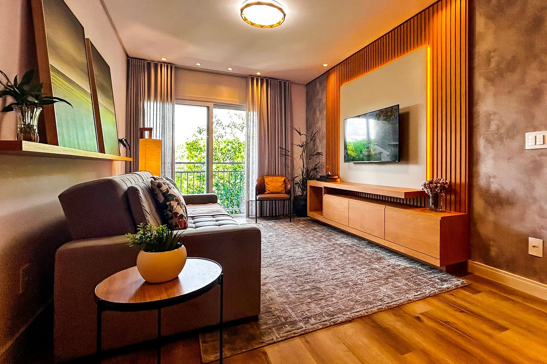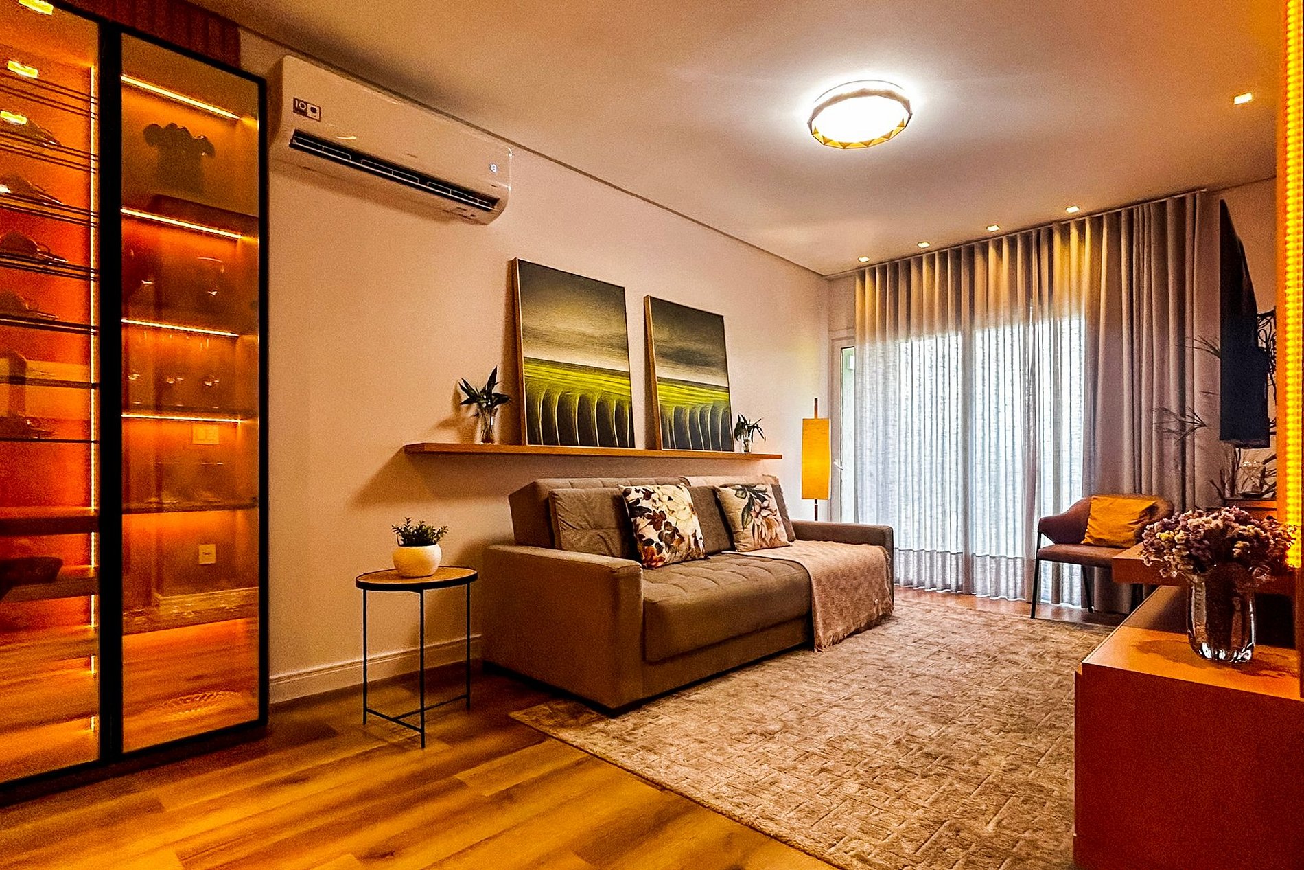 Sala: - TV Smart com acesso aos principais aplicativos de streaming. - 01 Sofá-Cama de Casal. - Ar condicionado