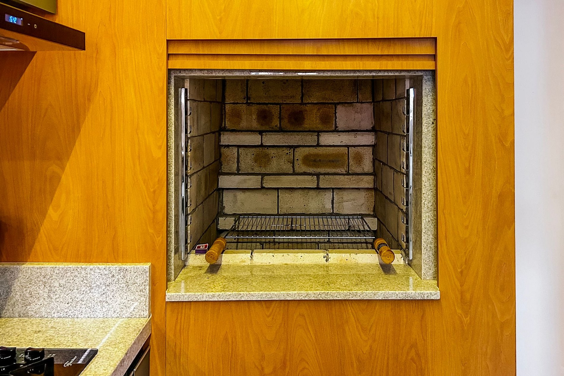 - Cozinha compacta equipada com geladeira e utensílios de cozinha. - Churrasqueira com todos os itens necessários para o preparo de um delícioso churrasco - Cooktop. - Micro-ondas. - Forno elétrico. - Chaleirá Elétrica - Sanduicheira. - Liquidificador. - Mesa para refeições , com taças de vinho, espumante e jogo de mesa posta. - Temperos e itens essenciais para a cozinha. - 01 Pano de Louça. - 01 Esponja. - Detergente.