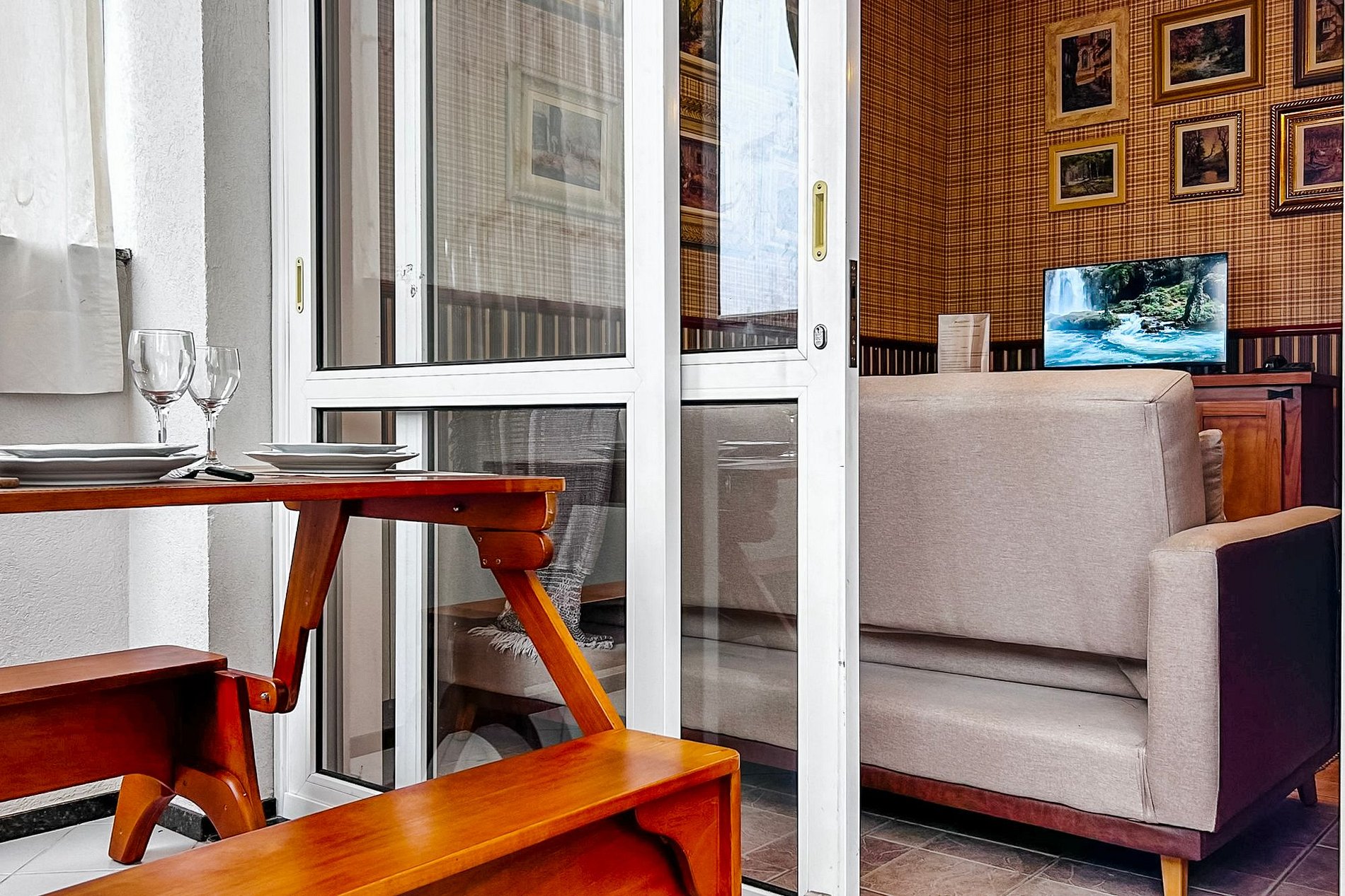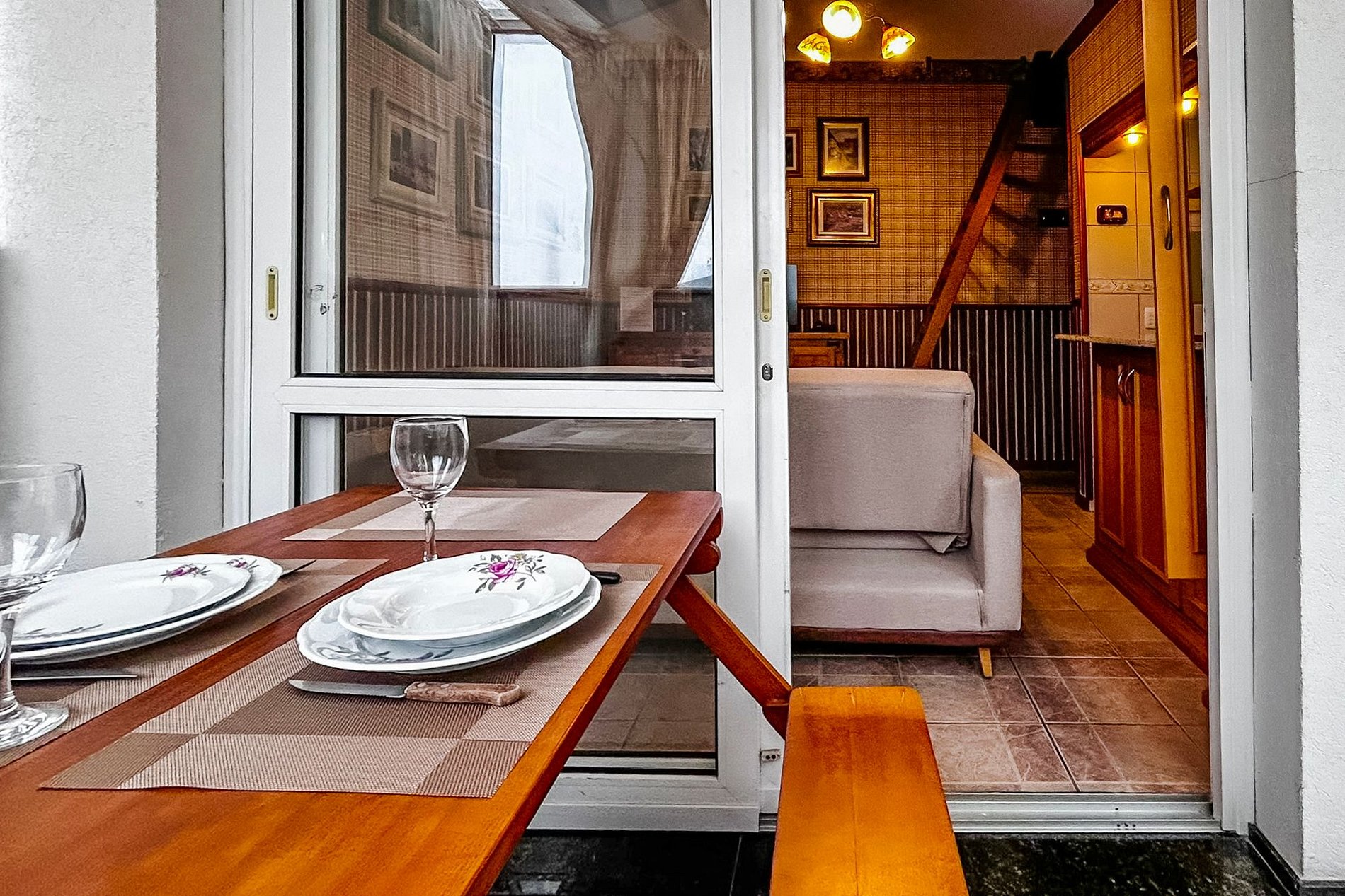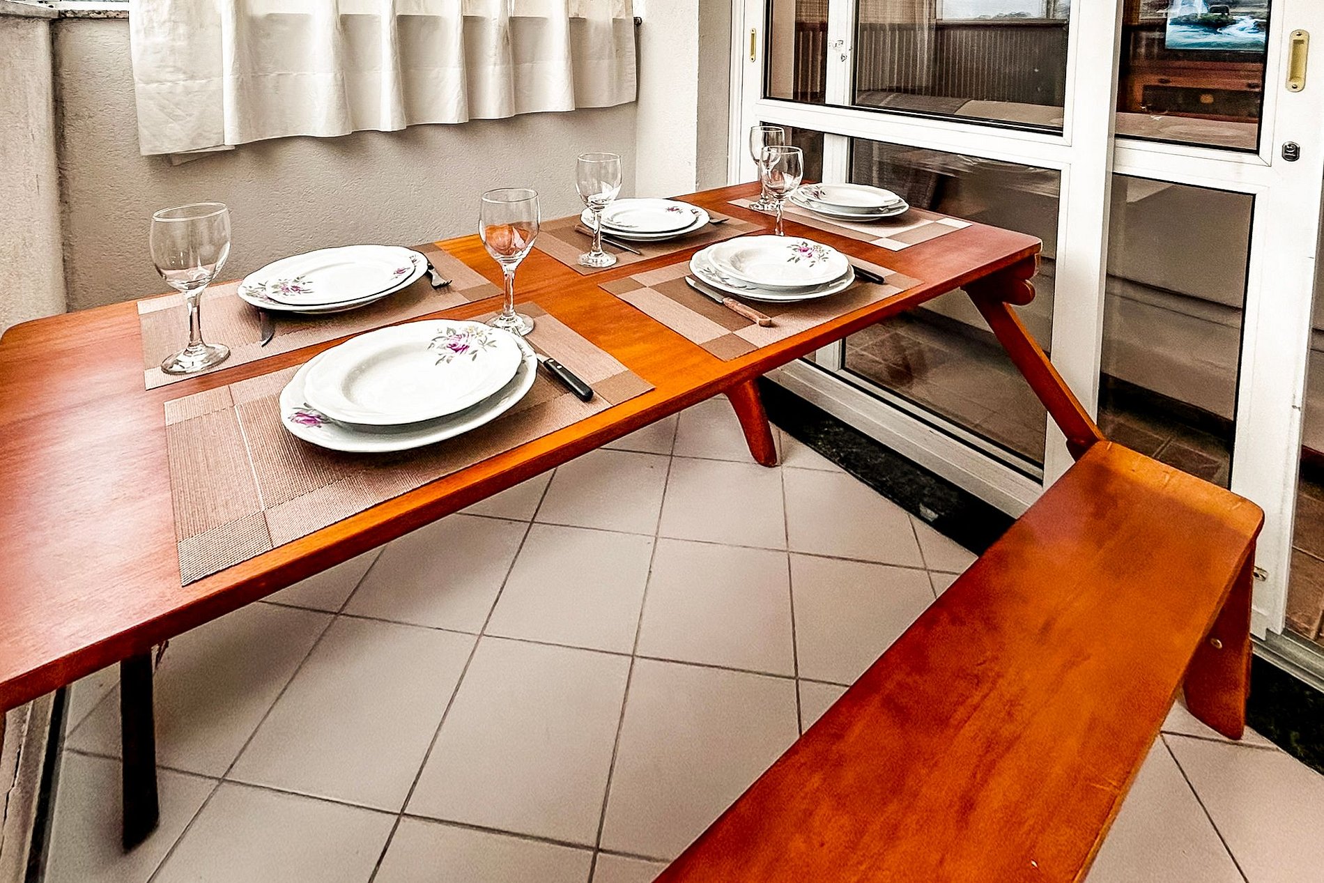 - Mesa para refeições , com taças de vinho, espumante e jogo de mesa posta.
