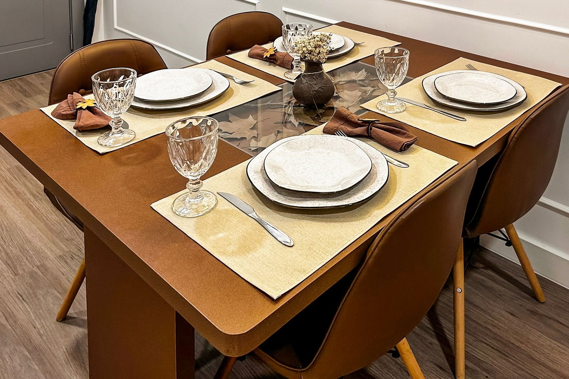 - Mesa para refeições, aparelho de fondue , com taças de vinho, espumante e jogo de mesa posta.