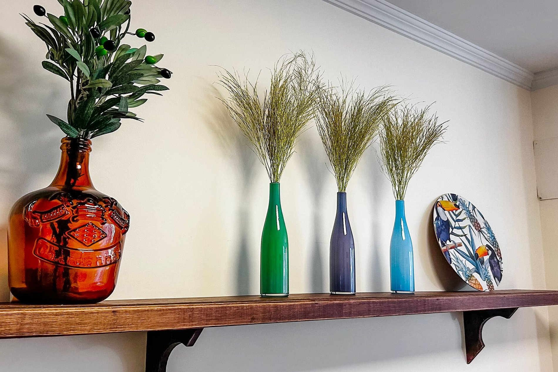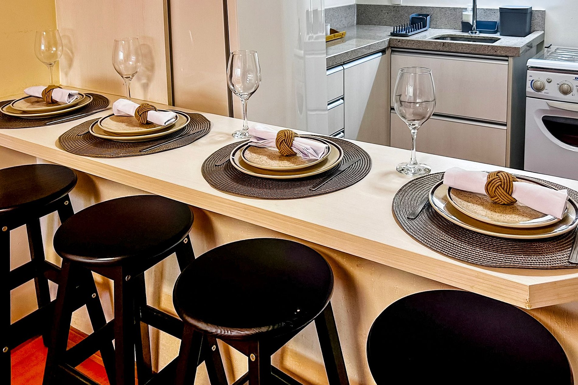 - Bancada para refeições , com taças de vinho, espumante e jogo de mesa posta.