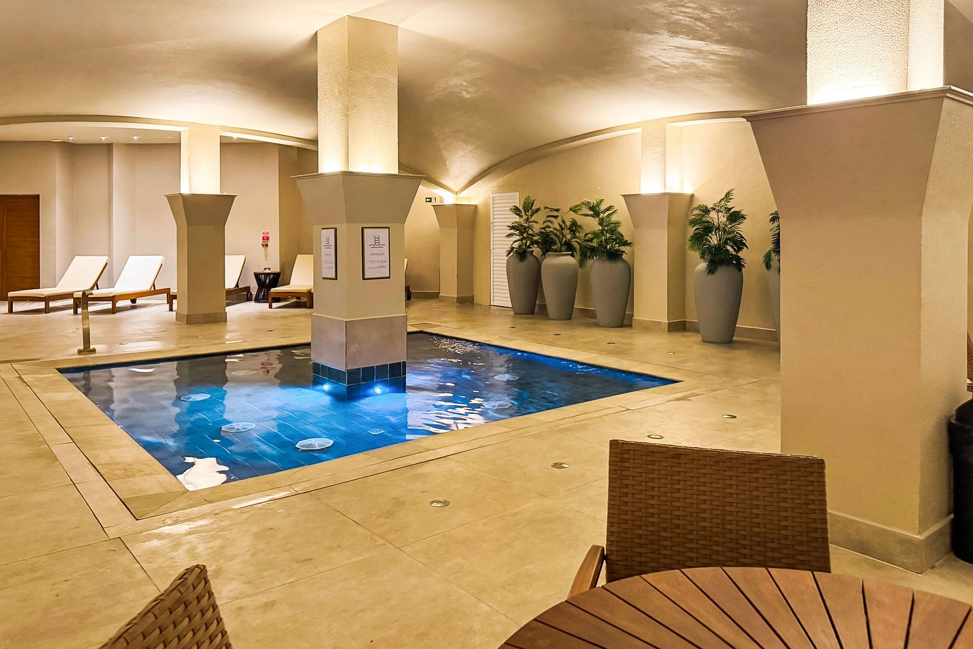 Parque de neve indoor com atividades de inverno, como esqui e snowboard.